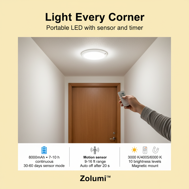 Featuring an 8000βmAh rechargeable battery, motion detection, color-temp adjustment, ten brightness levels, and a magnetic mount, Zolumiβ’ adapts to every corner of your home. Use sensor mode to save power or stay-on mode with timers for full control.